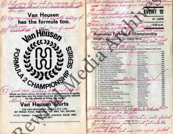 Scan of the Amaroo Park Raceway F2 Championship program [21 July 1974] showing the entry list with notes penned by the owner of the program.